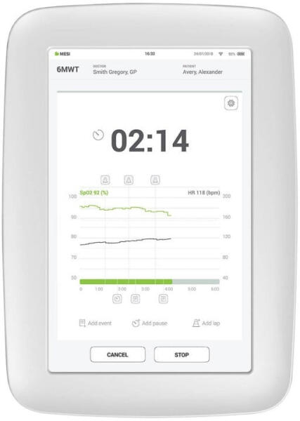 A 6MWT alkalmazást a MESI mTABLET-ekhez kifejezetten a 6 perces gyaloglásteszthez tervezték. Elvégzi a kardiopulmonális mérést és automatikusan kiszámítja a távolságokat. Az eredmények pontosak és precízek.
